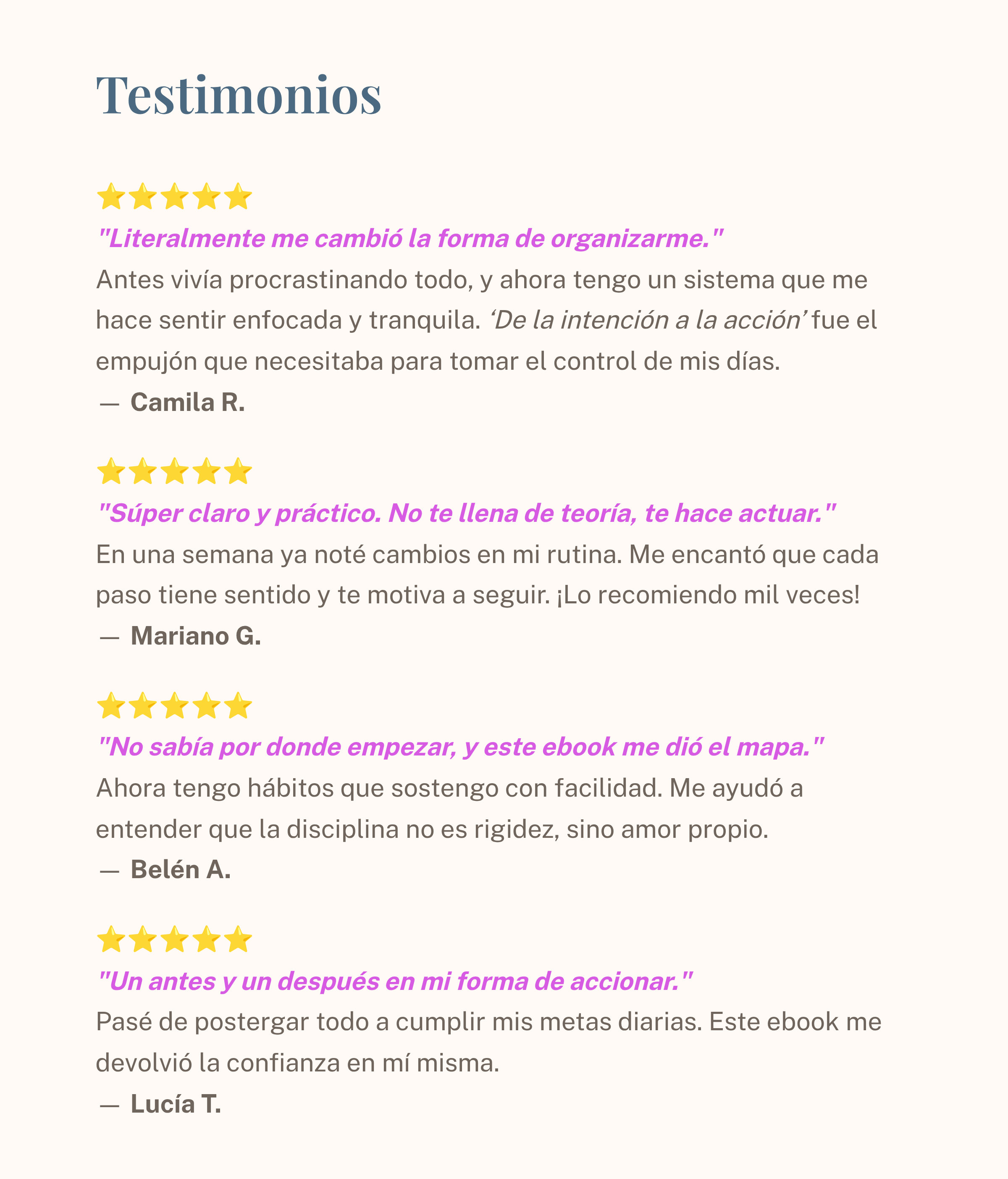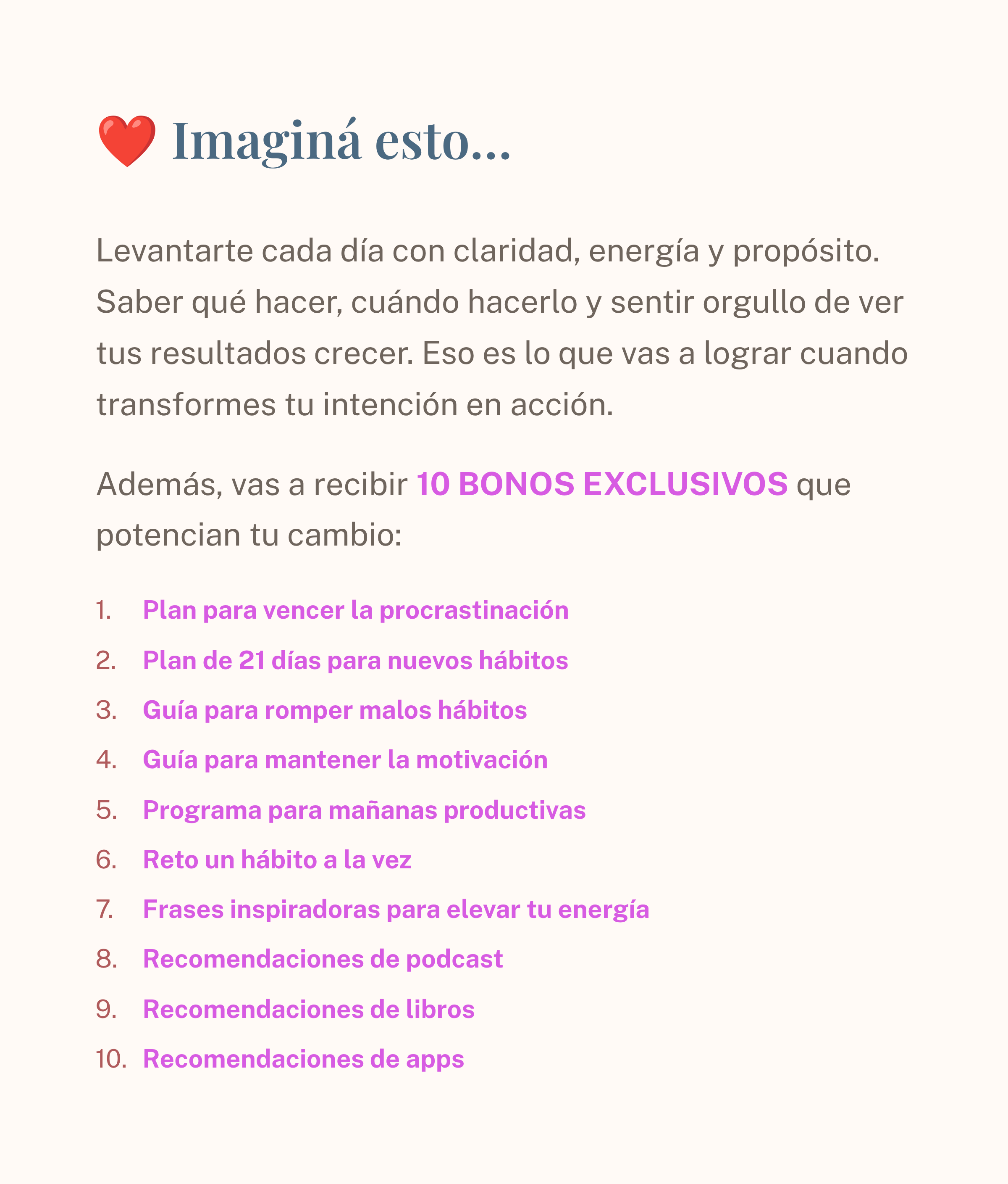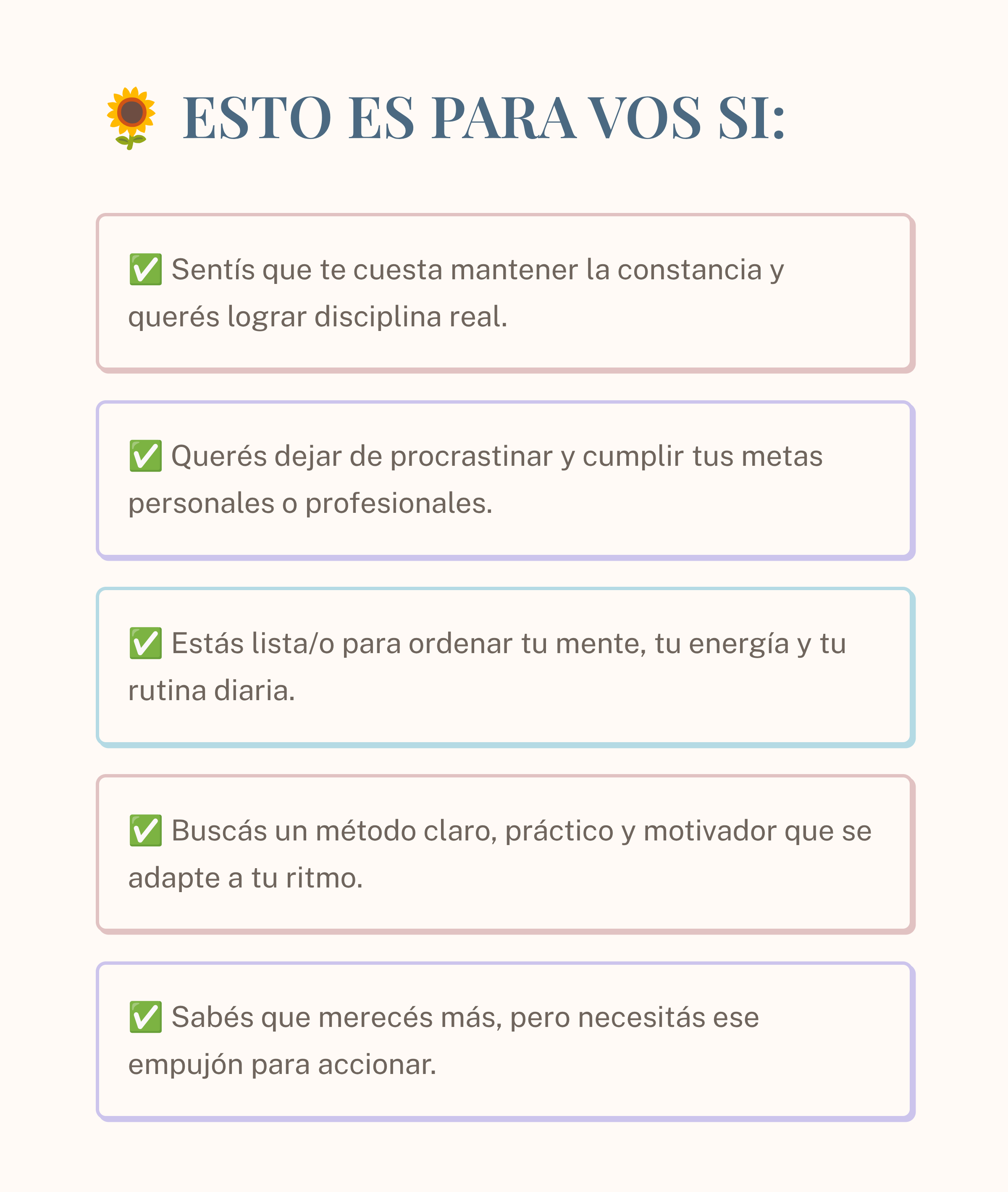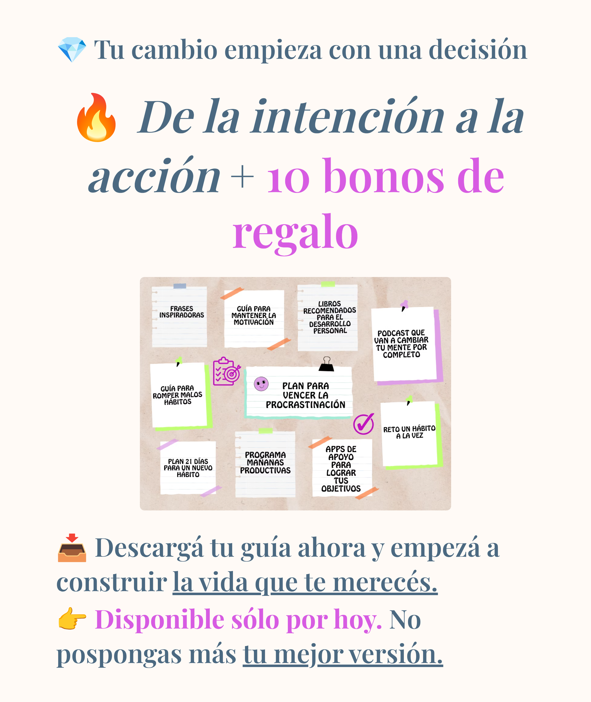 Te entiendo. La mayoría de los métodos fallan porque se enfocan solo en la motivación. Esta guía va más allá: te enseña a reprogramar tu mente y crear sistemas que te sostienen incluso cuando no tenés ganas. No vas a depender de la fuerza de voluntad, sino de un método que funciona.