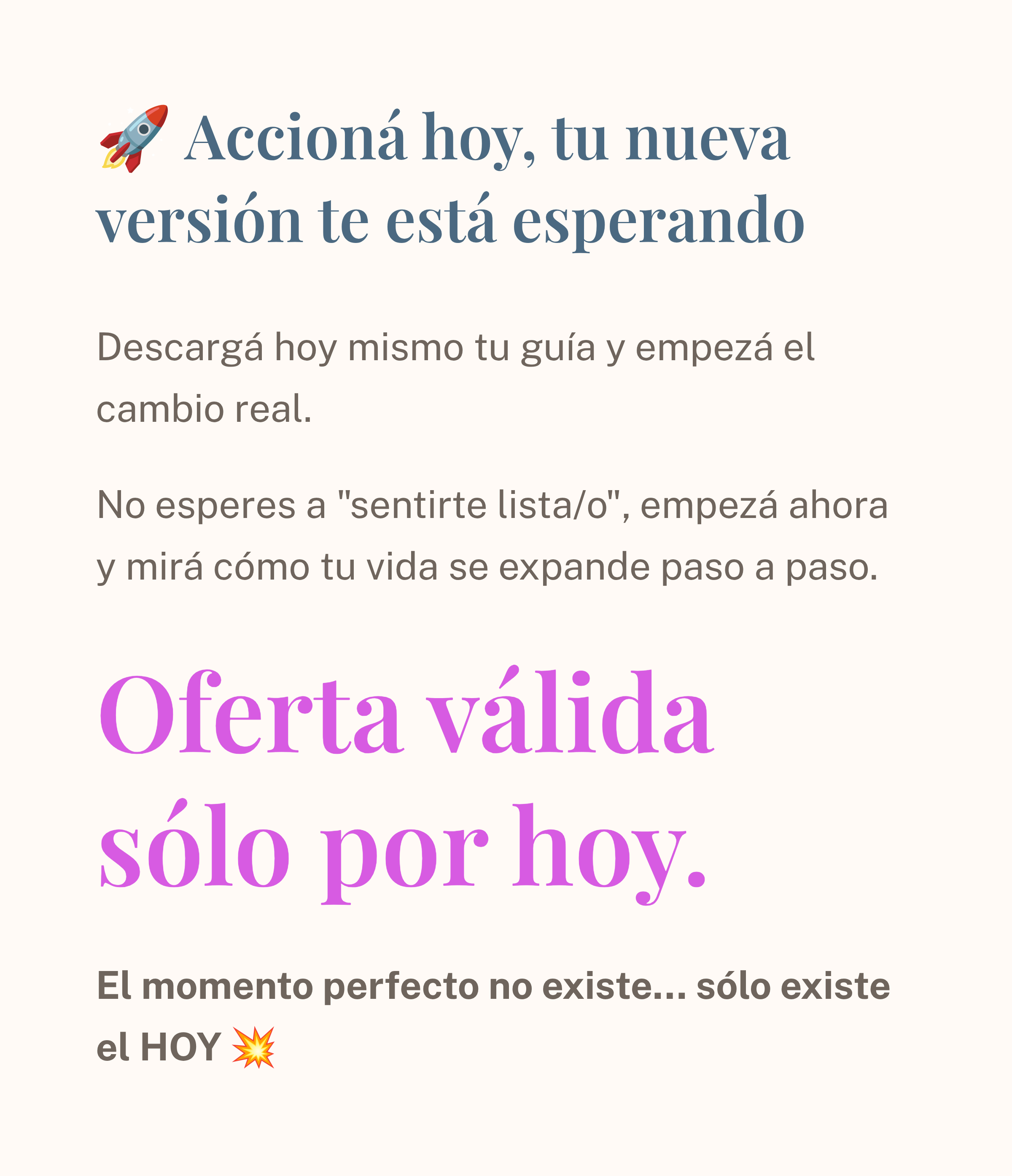 Porque esperar es lo que te aleja del cambio. Cada día que postergás, seguís en el mismo punto. Y hoy tenés la oportunidad de empezar tu transformación con una oferta especial y todos los bonos incluidos 💥 👉 Disponible solo por hoy.